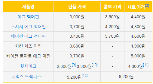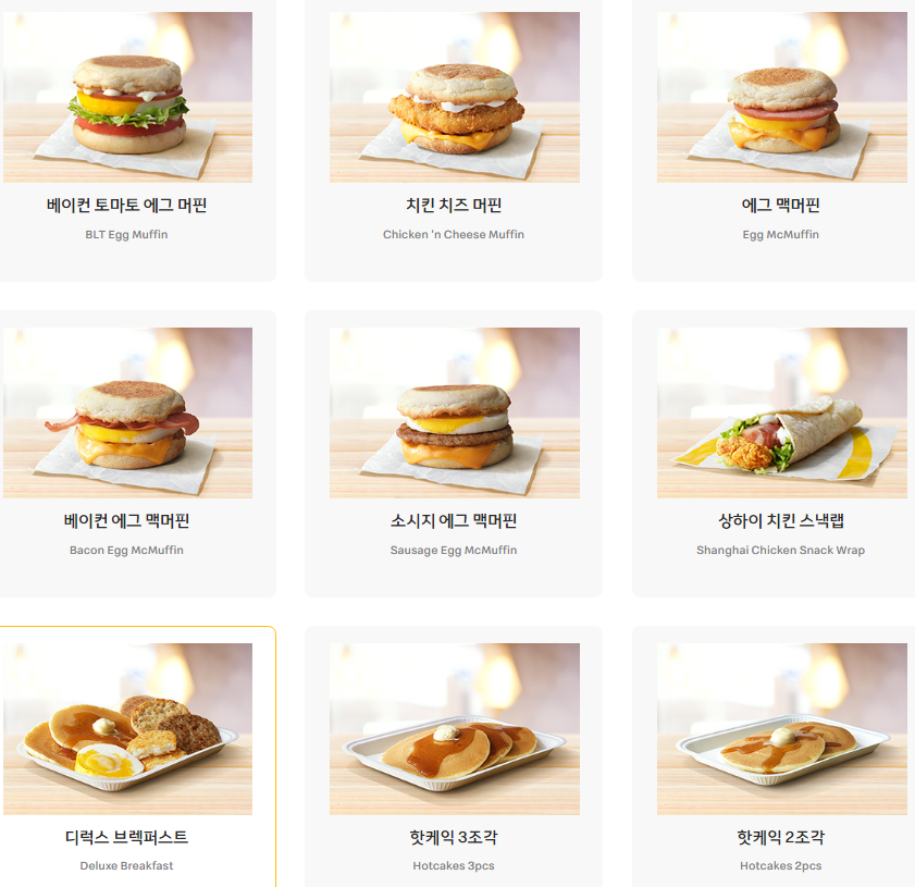 맥모닝 단품메뉴 및 세트메뉴