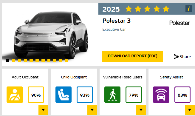 Polestar 3는 2025년 Euro NCAP 테스트에서 5성 등급을 획득하며, 특히 아동 탑승자 보호(93%)에서 역대 최고 점수를 기록했습니다. 성인 탑승자 보호(90%)는 다양한 충돌 시나리오에서 우수한 성능을 보였고, 취약 도로 사용자 보호(79%)는 일부 개선이 필요하지만 양호한 수준입니다. 안전 보조 시스템(83%)은 첨단 기술로 사고 예방과 대응을 강화했습니다. Polestar 3는 가족용 SUV로 안전성을 중시하는 소비자에게 탁월한 선택입니다. 자세한 결과는 Euro NCAP 웹사이트에서 확인하세요.